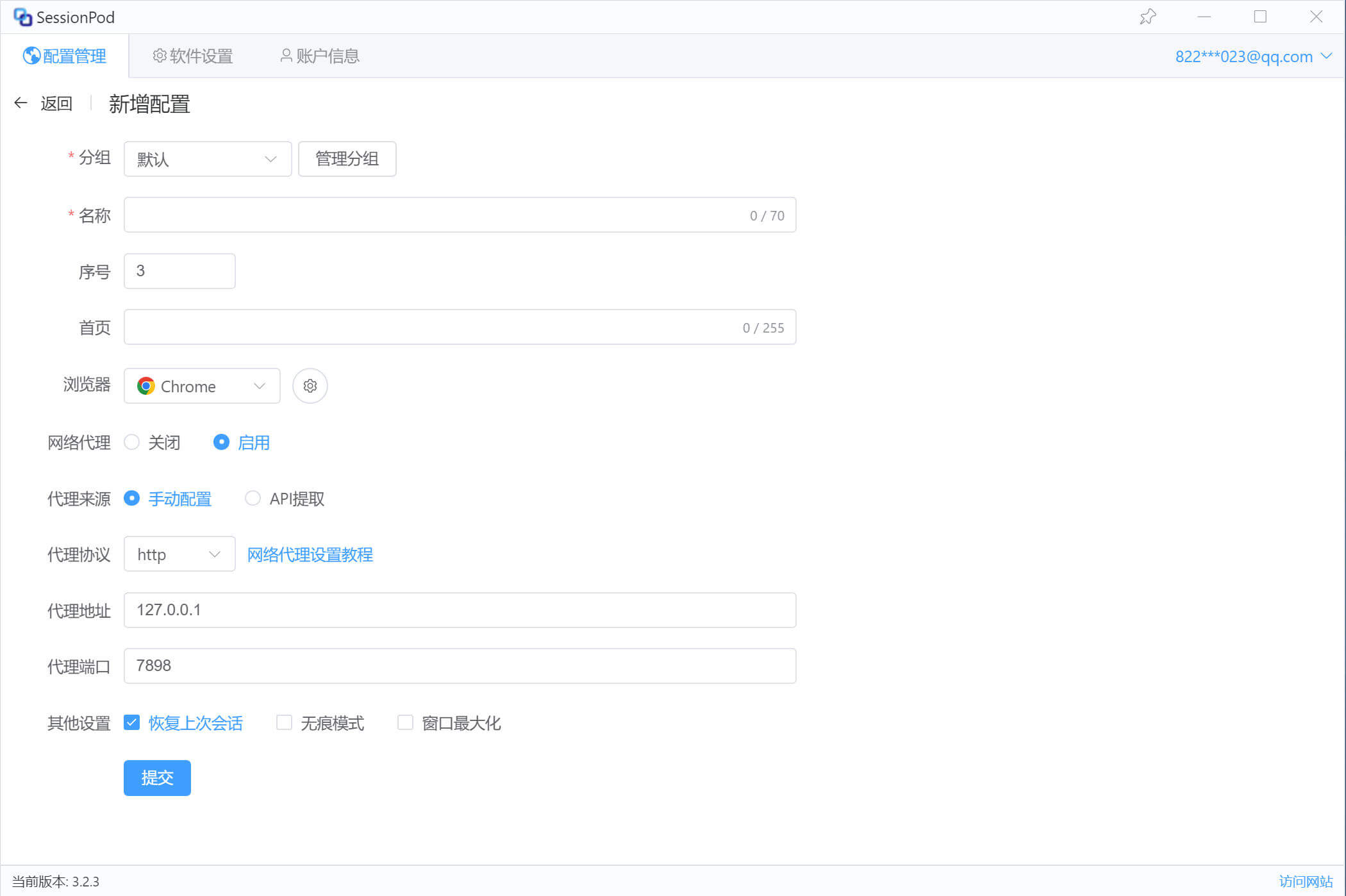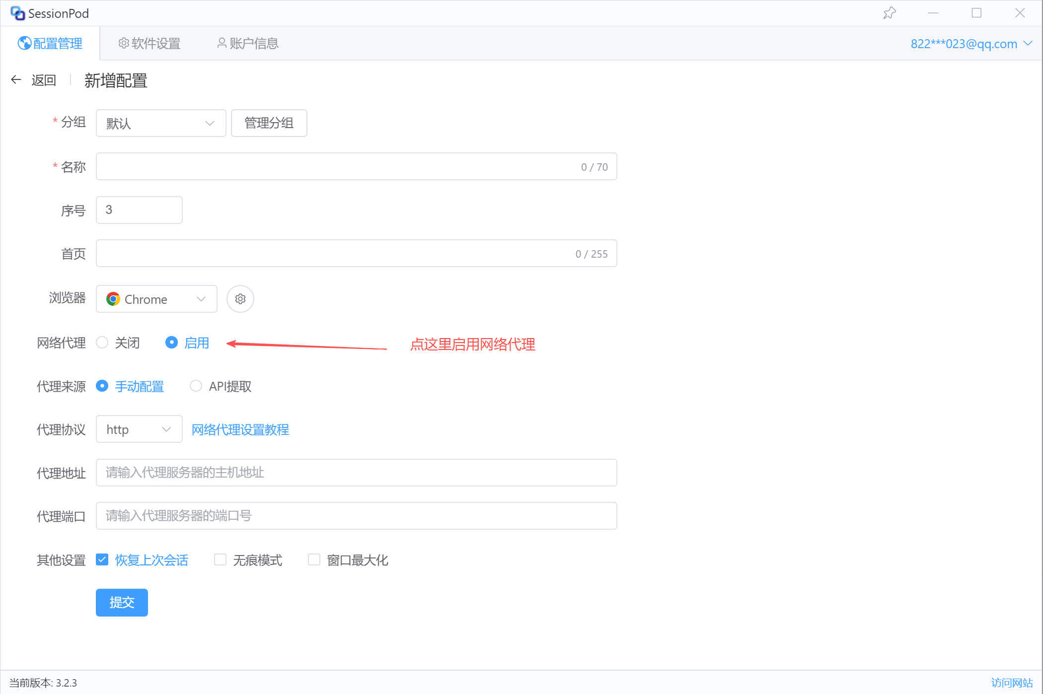 支持为每个浏览器配置单独配置网络代理信息。支持的网络代理协议:http,https,socks5,socks4。
